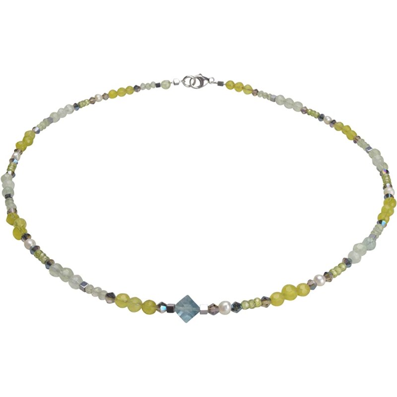 Edelsteincollier aus facettiertem Serpentin, facettiertem Aquamarin, Süsswasser Zuchtperle, facettiertem Peridot und mittiger, facettierter Flourit Kugel. Wir verwenden hierbei japanische Stahlseide. Geschlossen mit einem 925oo Silber Karabiner.