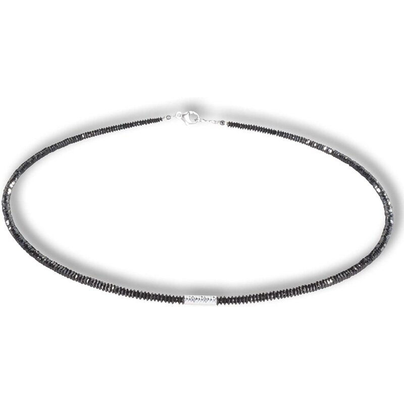 Die Kette ist auf der einen Seite eine klassische, schwarze Spinell-kette, die bei der geringsten Bewegung aber ein blitzen und glitzern hervorbringt. Mittig ist zusätzlich ein 925oo Silber facettiertes Mittelteil mit eingearbeitet. Geschlossen mit einem 925oo Silber Karabiner.
