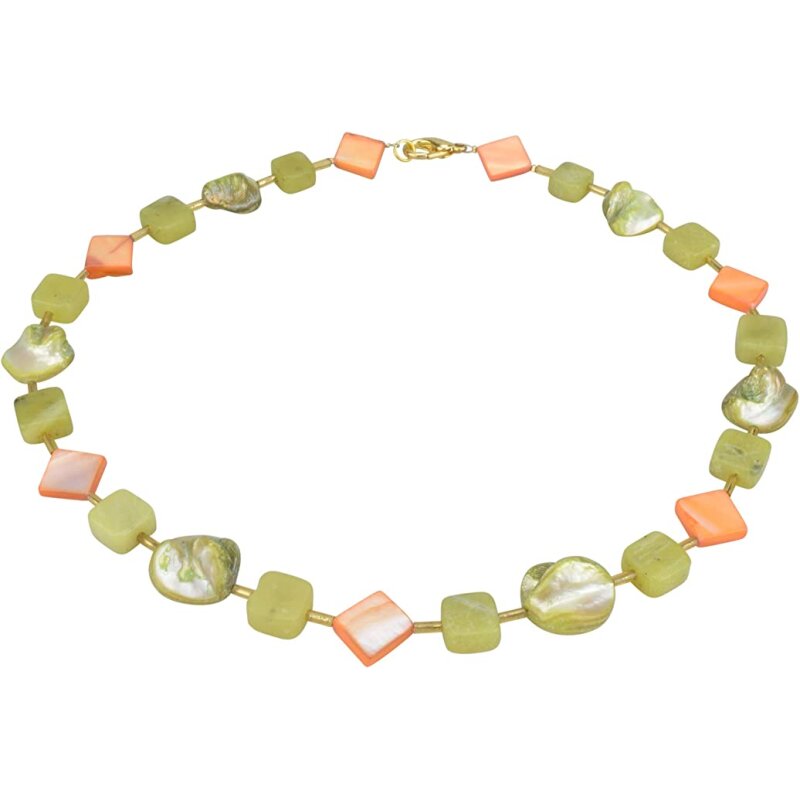 Maße: Länge ca. 44 cm, Gewicht: 30 Gramm ( = ca. 150 Karat), Serpentin: ca. 9.5 x 9.5 x 5 mm, Perlmutt orange: 10 x 10 x 3.5 m, Perlmutt grün: Ø 10 - 14 x 7.5 - 10 mm.
